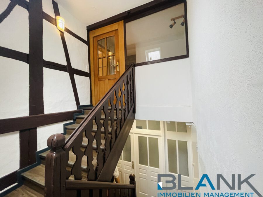 Historisches Treppenhaus mit liebevoll erhaltenen Fachwerkelementen und massivem Holzgeländer