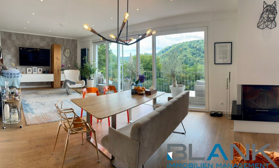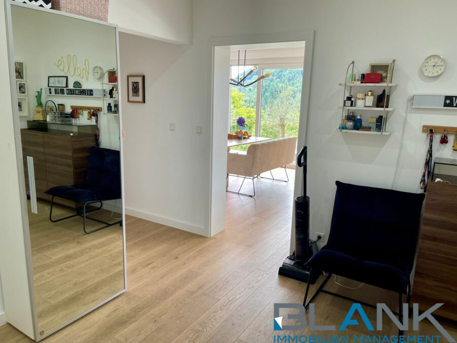 In direkter Umgebung laden Grünanlagen und ein nahegelegener Park zu Spaziergängen und Erholung im Alltag ein. Von der Wohnung aus eröffnet sich ein weiter Blick auf die bewaldeten Hügel der Umgebung, was die besondere Wohnqualität zusätzlich unterstreicht.