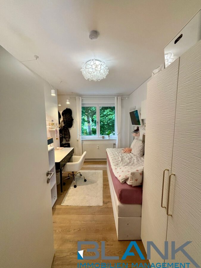 Gegenüberliegend befindet sich das ruhig gelegene Schlafzimmer mit eigenem Zugang zum Balkon mit Blick ins Grüne. Hier entsteht ein privater Rückzugsort mit angenehmer Lichtführung.