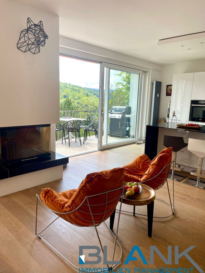 Das Herzstück bildet der großzügige Wohnbereich mit ca. 30 m². Dieser ist offen konzipiert und vereint Küche, Essbereich und Wohnzone zu einer repräsentativen Einheit. Die Raumgestaltung schafft fließende Übergänge und eine angenehme Großzügigkeit, ohne dabei an Struktur zu verlieren. Vom Wohnbereich aus besteht direkter Zugang zur weitläufigen Terrasse mit schönem Waldblick, die den Wohnraum elegant ins Freie erweitert und zusätzlichen Lebensraum bietet.